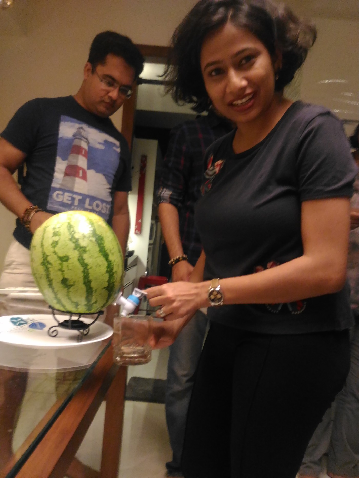 - Start scooping out the watermelon fruit from with in the bigger part (The Pot).
