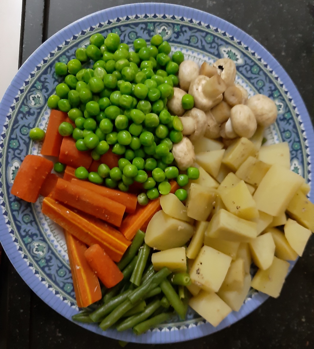 a delicious meal made with chicken, potatoes, onions, carrots, peas and optional sweet potatoes