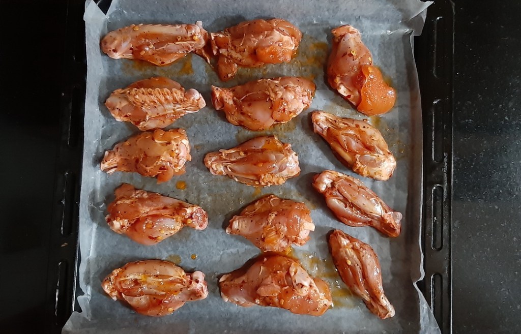 - Arrange the wings in an even layer on the prepared baking sheet.