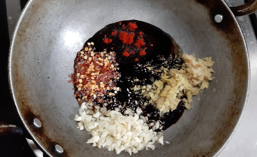 - In a medium saucepan over medium heat, bring honey, soy sauce, ginger, garlic, chili flakes and chili powder to a boil.