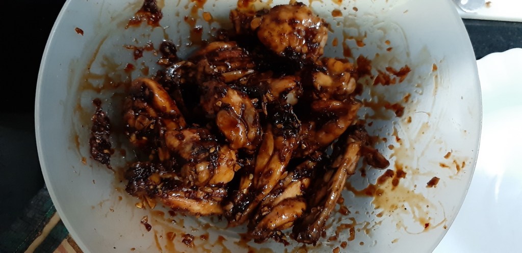 - Gently toss the chicken wings to coat evenly and set it aside for few minutes