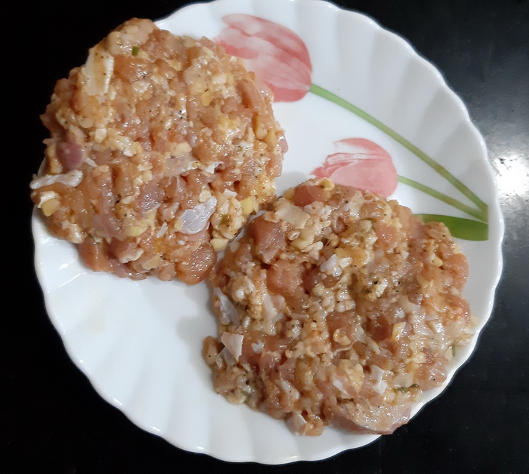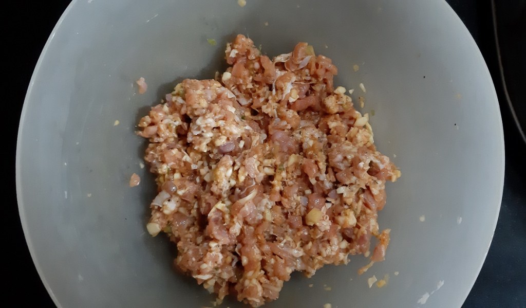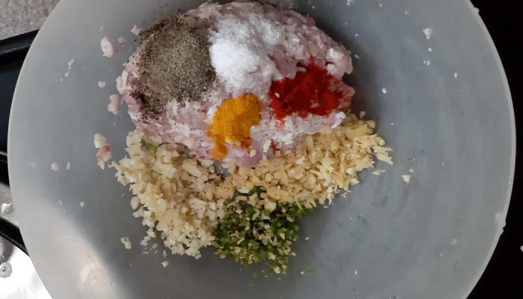 In a large bowl, add minced meat. salt, finely chopped ginger and garlic, black pepper and chili powder. Use your hands to mix the ingredients until they are nicely combined
