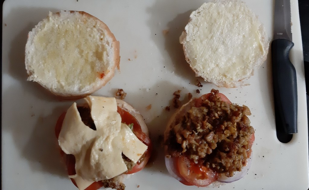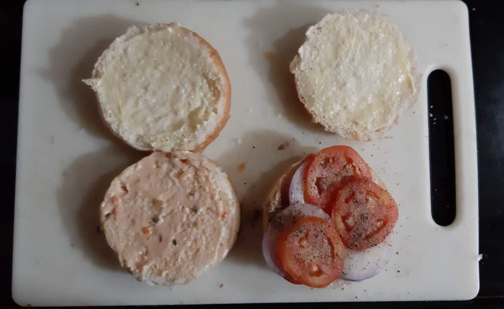 - Meanwhile as the meat patty cooks, prepare the burger and the fillings