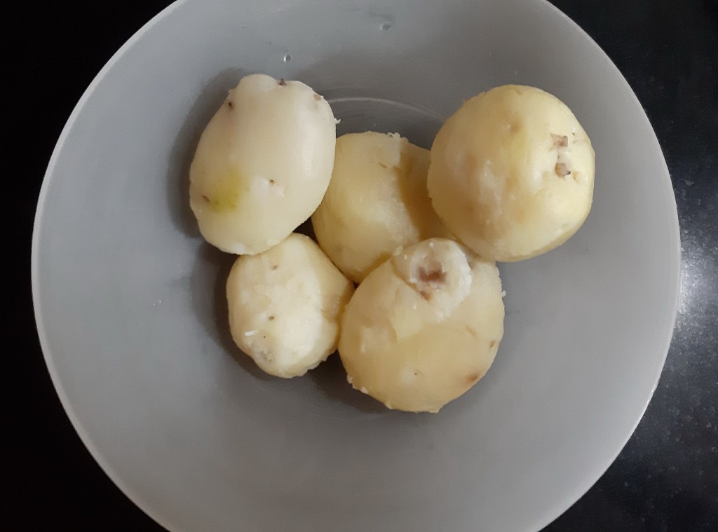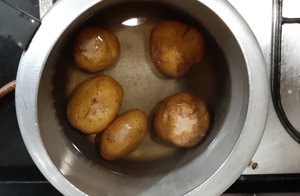 - Add the potatoes into a pressure cooker filled with water so that the potatoes are submerged in the water completely