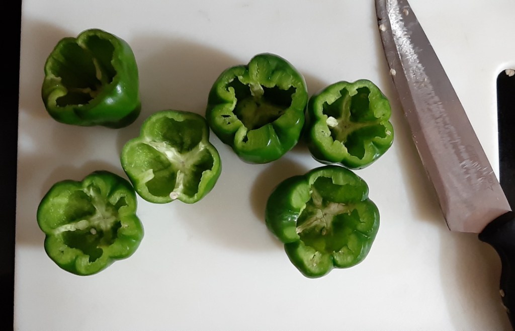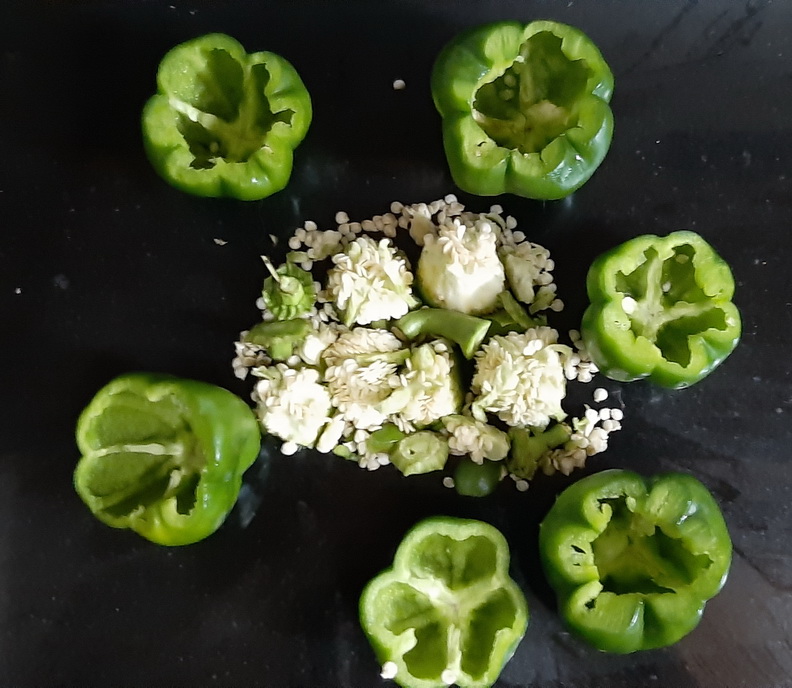 While the Potatoes are on the gas, wash the bell peppers, pat them dry with kitchen towel. Slice off the top and remove the seeds from inside to make them hollow.