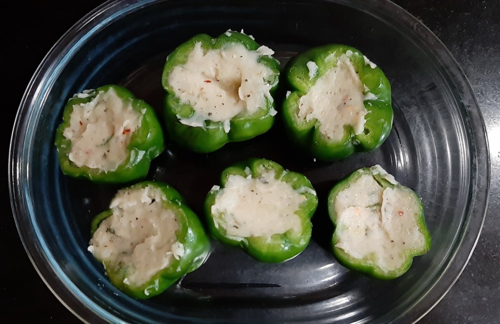 - Now stuff the bell peppers with this filling and place them on the baking dish that is already greased with olive oil
