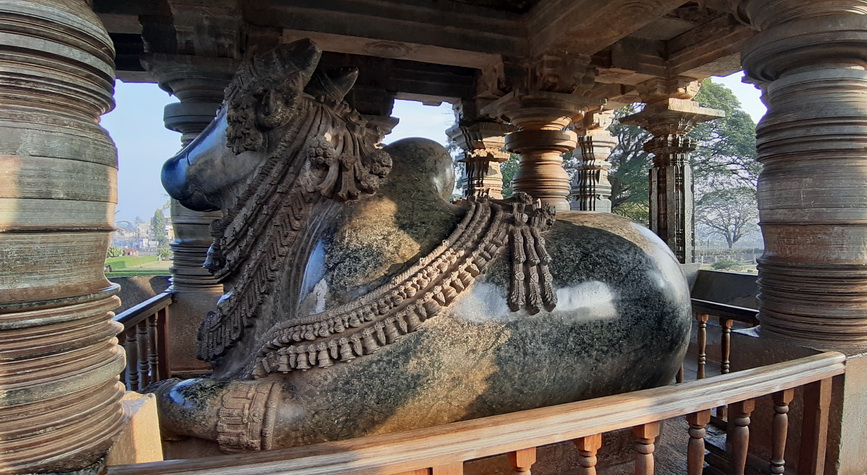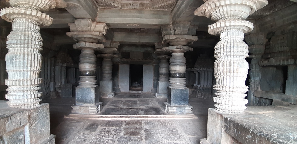 This Nandimantapa situated just in front of the Hoysaleswara temple. The mantapa also has a shrine of Surya which houses a 2 m tall figurine of the deity. The Parswanatha Halli with polished pillars is a prime attraction which shows distorted reflections of the onlookers.