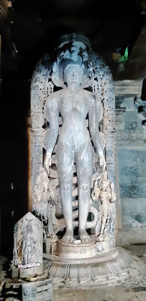 The Parshwanatha Swamy figure is made out of black stone and it is 14 feet in height. A seven-headed serpent carved at the head of this figure appears to be guarding the deity